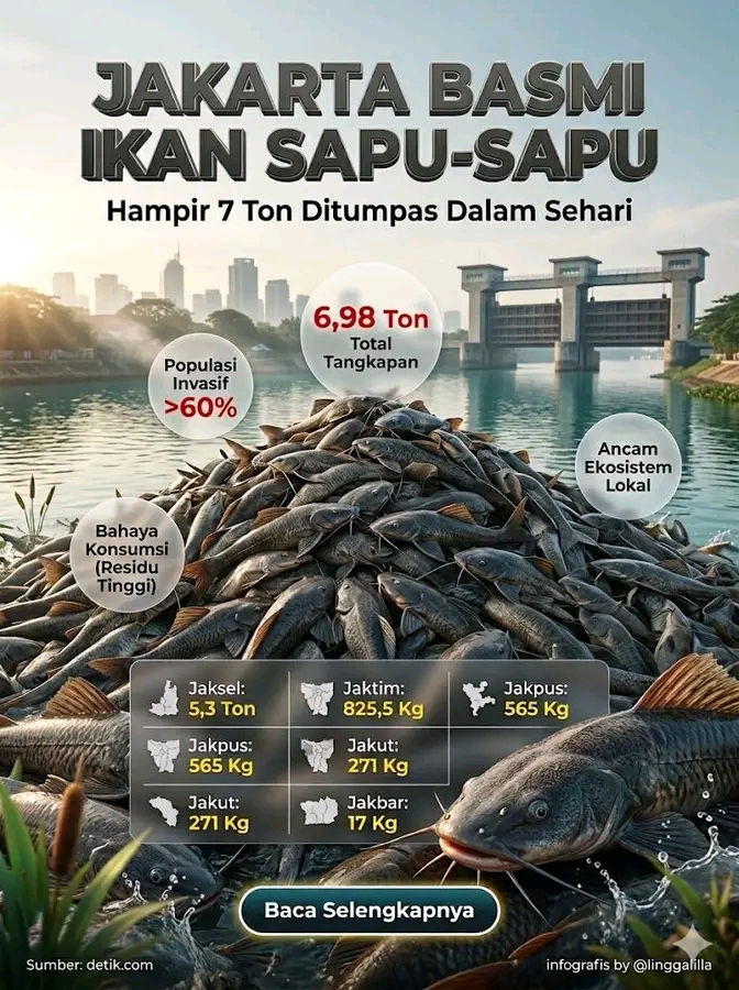 Wartaindonesia.web.id – Jakarta sampai harus membasmi ikan sapu-sapu dalam jumlah besar—bahkan hampir 7 ton dalam sehari! Ikan yang dikenal sebagai “pembersih akuarium” ini ternyata jadi spesies invasif di alam liar. Populasinya meledak, mengganggu ekosistem, bahkan berpotensi berbahaya kalau dikonsumsi karena kandungan residu tinggi. Ini jadi pengingat penting. Tidak semua yang terlihat “berguna” di rumah, aman dilepas ke alam. Sekali ekosistem terganggu, dampaknya bisa besar banget. Menurut kamu, solusi terbaik buat masalah ini apa?